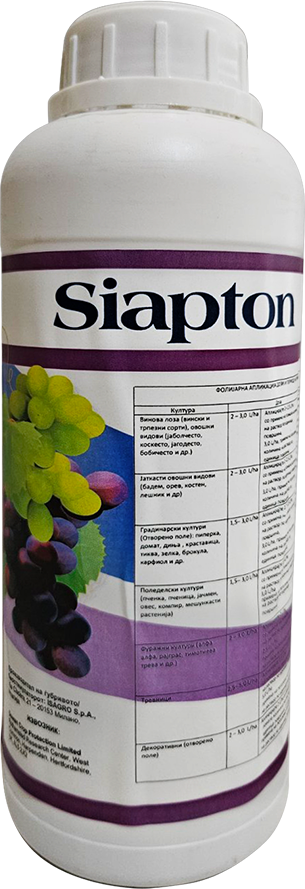 Примена: SIAPTON може да се применува фолијарно и преку фертиригација во градинарство, поледелство, овоштарство и лозарство.